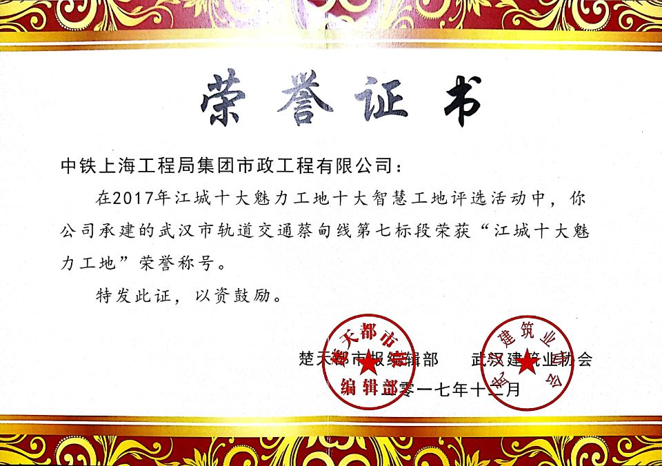 1月7日,江城“十大魅力工地”“十大智慧工地”頒獎(jiǎng)儀式在武漢市楚天傳媒大廈楚天會(huì)堂隆重舉行。由市政公司承建的武漢市軌道交通蔡甸線第七標(biāo)段項(xiàng)目喜獲“十大魅力工地”稱號(hào),這也是中鐵上海局自進(jìn)入武漢市場(chǎng)以來(lái)首次獲得該項(xiàng)榮譽(yù)。